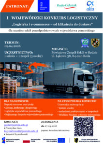 Powiatowy Zespół Szkół w Redzie zaprasza uczniów szkół ponadpodstawowych z województwa pomorskiego do udziału w I Wojewódzkim Konkursie Logistycznym, organizowanym pod patronatem Uniwersytetu Gdańskiego. Konkurs realizowany i finansowany jest w ramach projektu: „Zintegrowany rozwój publicznej edukacji zawodowej w Powiecie Wejherowskim” w ramach przedsięwzięcia strategicznego „Kształtowanie sieci szkół zawodowych na Pomorzu – etap II”.