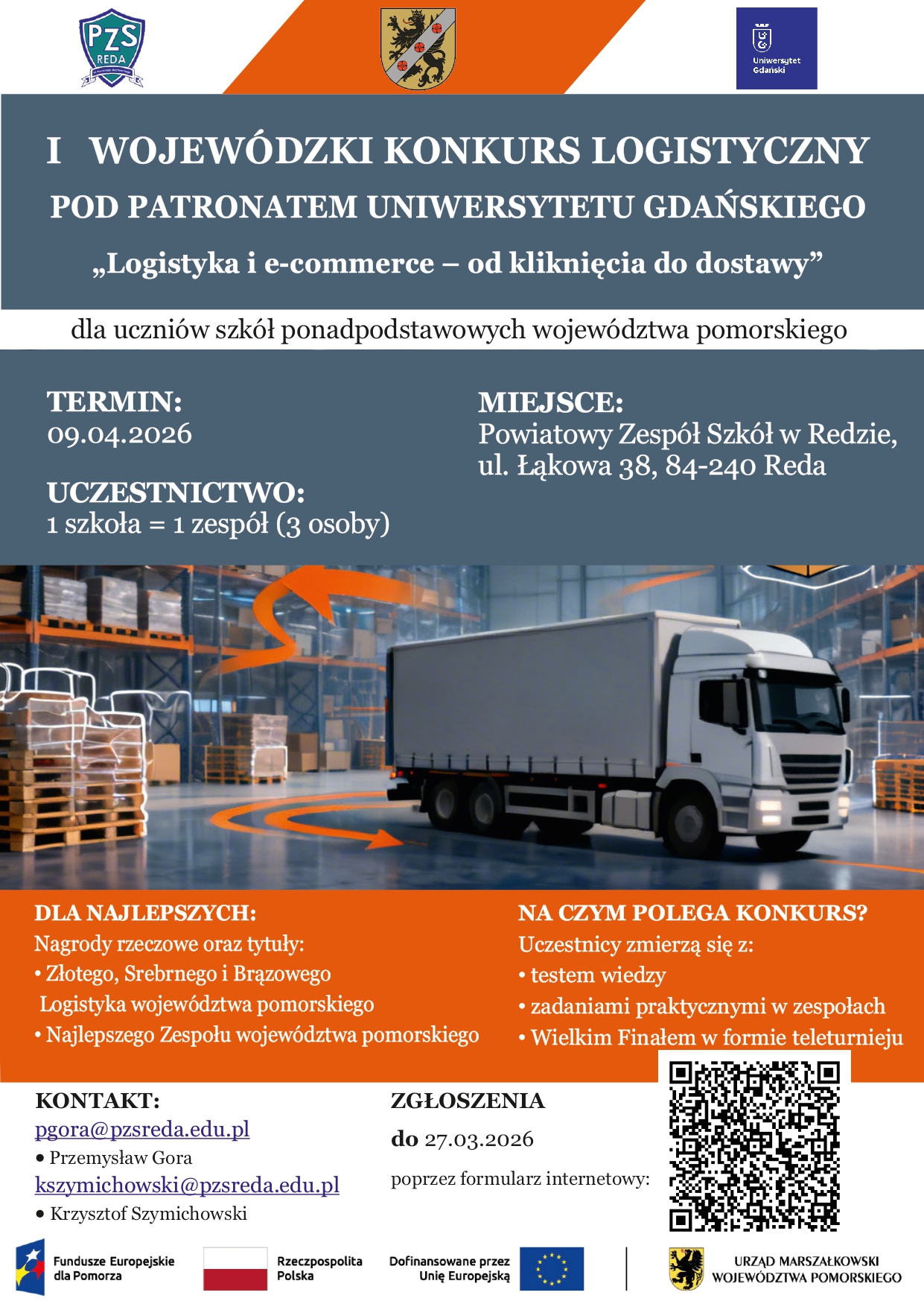 Powiatowy Zespół Szkół w Redzie zaprasza uczniów szkół ponadpodstawowych z województwa pomorskiego do udziału w I Wojewódzkim Konkursie Logistycznym, organizowanym pod patronatem Uniwersytetu Gdańskiego. Konkurs realizowany i finansowany jest w ramach projektu: „Zintegrowany rozwój publicznej edukacji zawodowej w Powiecie Wejherowskim” w ramach przedsięwzięcia strategicznego „Kształtowanie sieci szkół zawodowych na Pomorzu – etap II”. Konkurs stanowi wyjątkową okazję do sprawdzenia wiedzy oraz praktycznych umiejętności … Czytaj dalej I Wojewódzki Konkurs Logistyczny „Logistyka i E-commerce – od kliknięcia do dostawy”