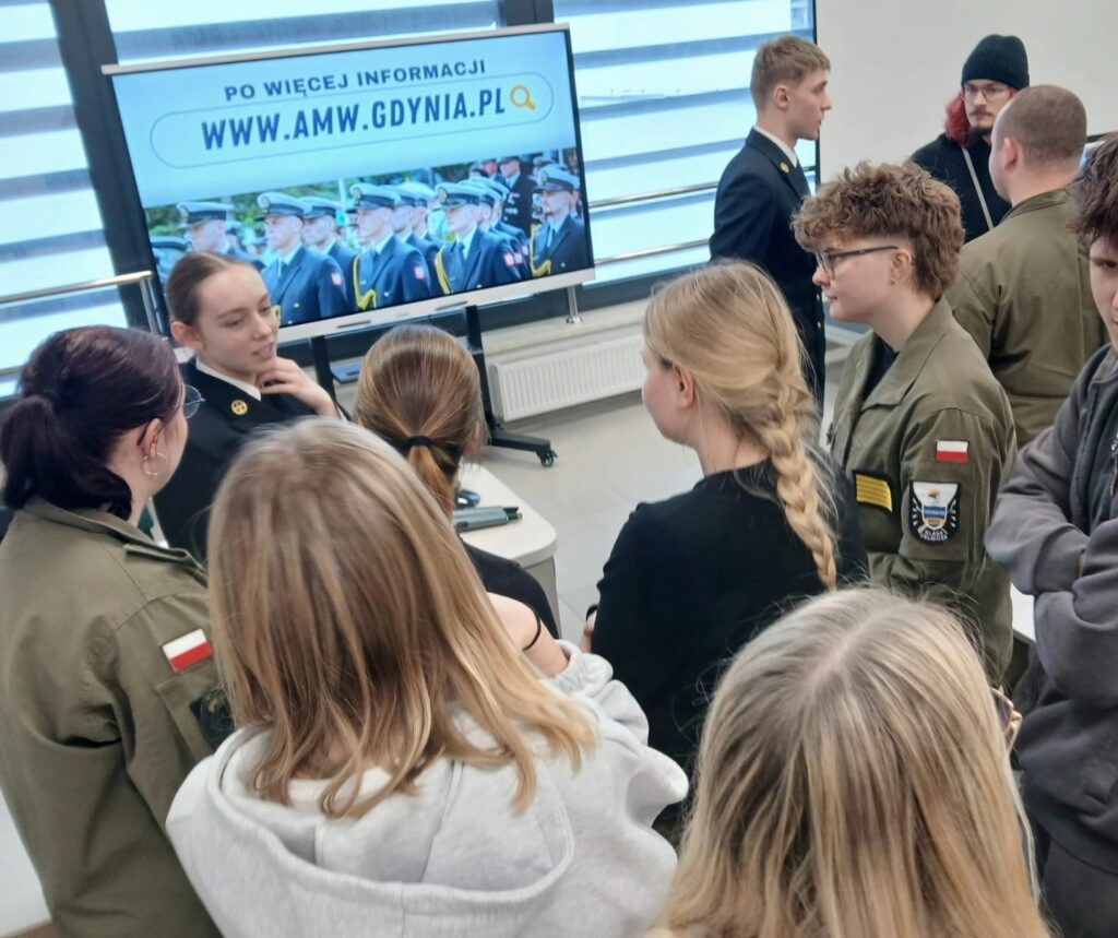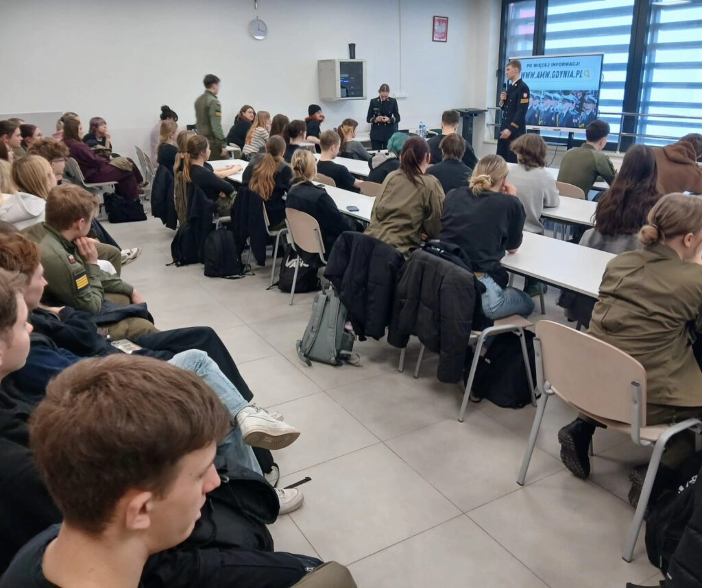 04.03.2026r. uczniowie klas maturalnych mieli okazję spotkać się ze studentami Akademia Marynarki Wojennej – naszymi absolwentami. Goście przedstawili szczegółowe informacje dotyczące procesu rekrutacji, wymagań zdrowotnych i sprawnościowych oraz możliwości rozwoju, jakie oferuje uczelnia. Opowiedzieli również o swoich doświadczeniach, codziennym życiu na studiach, szkoleniach wojskowych oraz realiach kształcenia w systemie wojskowym. Po części oficjalnej wielu uczniów podchodziło, aby indywidualnie porozmawiać, dopytać o konkretne kierunki, przebieg służby i perspektywy zawodowe. Spotkanie było inspirujące i dla części maturzystów stało się realnym impulsem do rozważenia ścieżki wojskowej w swojej przyszłości.