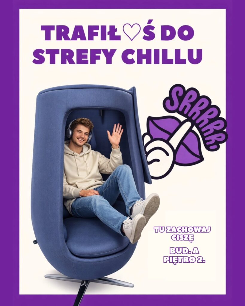 Na 2. piętrze w budynku A powstała specjalna strefa chillu i wyciszenia – miejsce, w którym możecie na chwilę zwolnić, odpocząć i złapać oddech w ciągu szkolnego dnia.